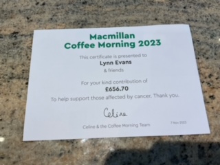 Lynne Evans, the Leader of the Taunton Branch of the Somerset Masonic Friendly Association (SMFA) received a lovely thank you letter from Macmillan Cancer, after recently raising £656.70, by holding an afternoon “Tea-party” for neighbours family and friends as well as members of the SMFA, including several committee members, Karen Dingle and Hayley Hunt who were great help!