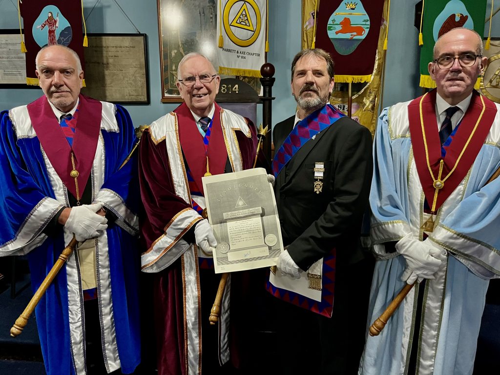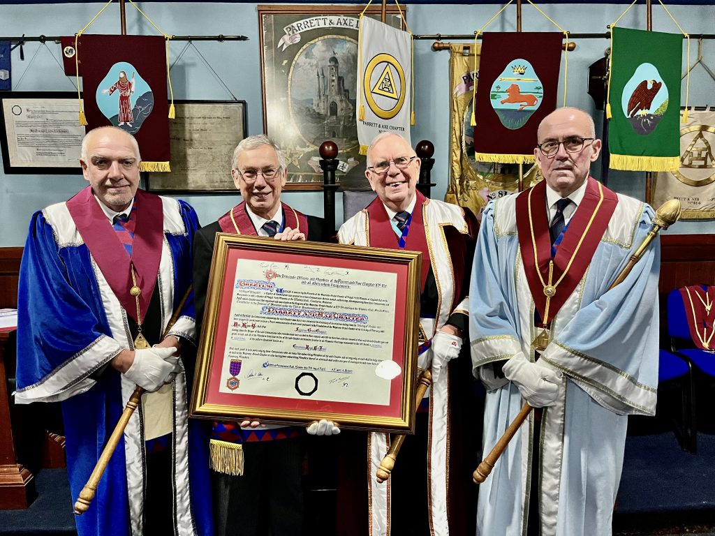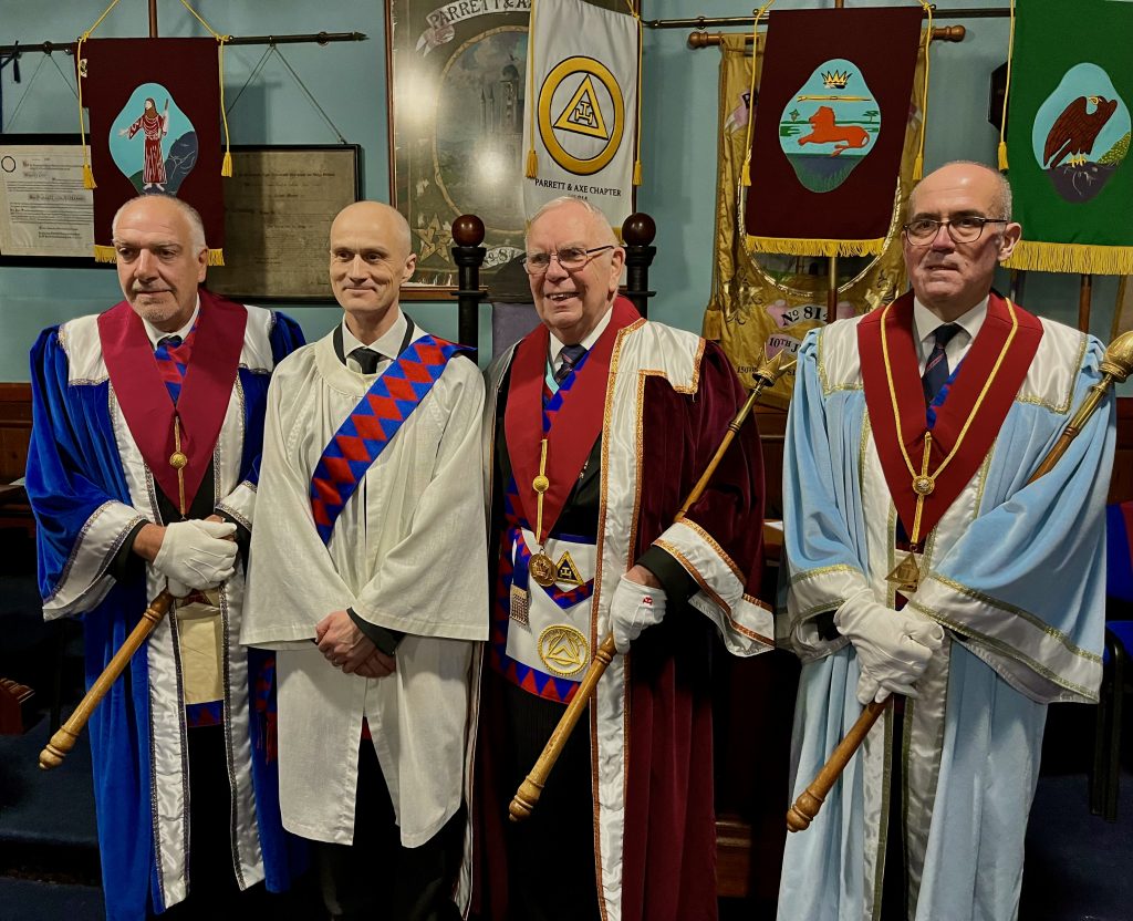 On the evening of 28th November 2023 at Parrett & Axe Chapter in the town of Crewkerne there was a busy and excellent meeting. The highlight was the Exaltation of Bro Dylan Edgar a member of Nyanza Lodge. We also received our Centenary Warrant which was presented by EComp David Wakely PGScN who had the warrant framed and it looks superb. Companion Dean Wilton was also presented with his Chapter Certificate. The ceremony was followed by a fun and light-hearted festive board. We are looking forward to the next meeting on 23rd Jan 2024 when we will welcome the Most Excellent Grand Superintendent – E Comp Ray Guthrie and his Provincial team.