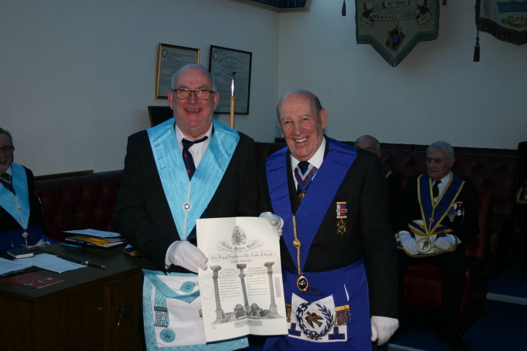 On Tuesday the 16th January Estune held their first regular meeting of the year and what a night it was with a passing, a presentation of a Grand Lodge Certificate and a Burns Supper. The WM Mark and his team of officers conducted a fantastic ceremony in the passing of Bro Ed Colburn to the degree of fellowcraft. Bro Ed was a great candidate and conducted himself in great style as he made his way around the lodge. The tools were presented in fine form and W.Bro Bob Cook delivered a passionate rendition of the tracing board.