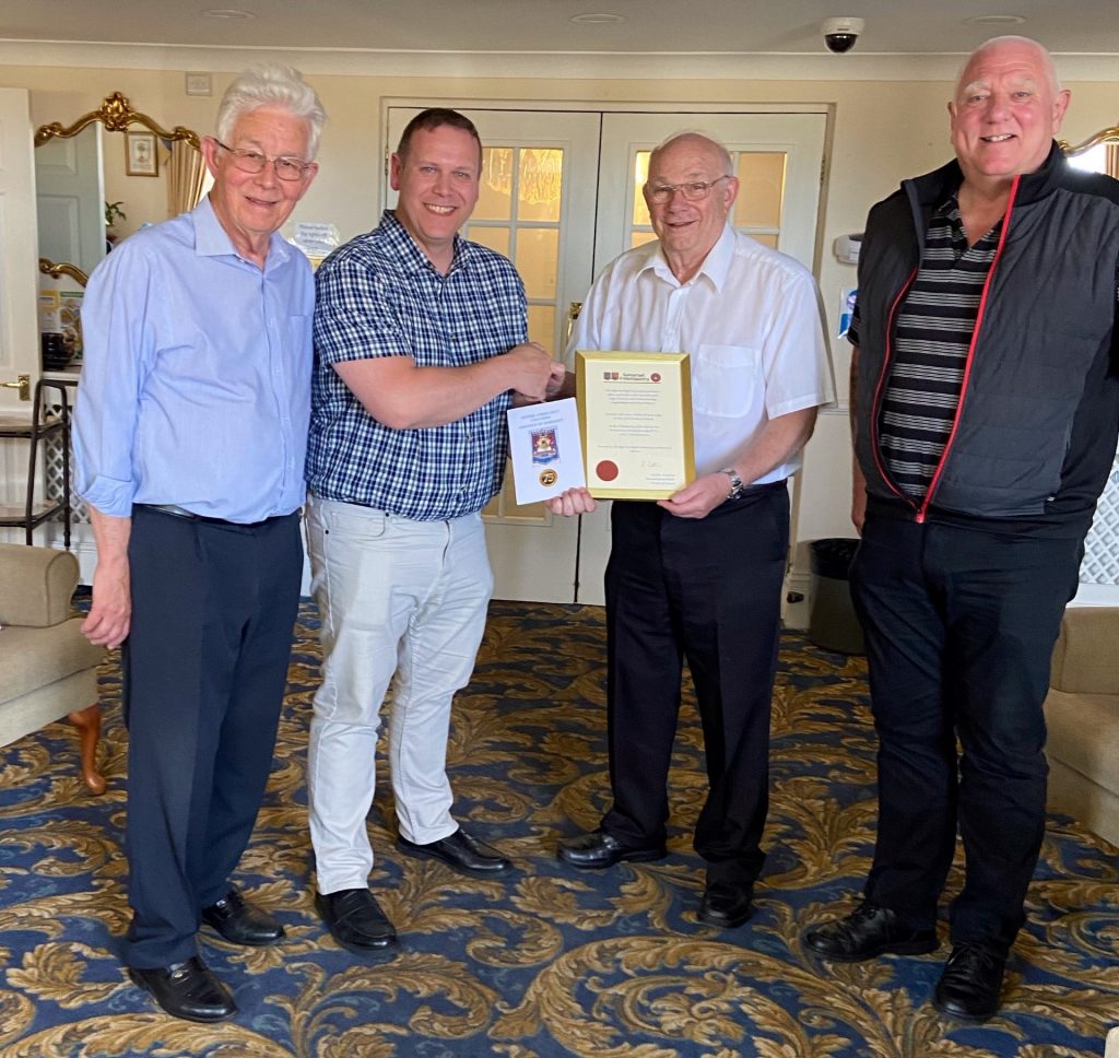 There they met with Country Member of Estune, Chris Owen, and his wife June for a very pleasant task – to present to Chris a 50th anniversary Veteran’s Certificate and badge on behalf of Estune Lodge, and Freemasons across Somerset and Bristol.
