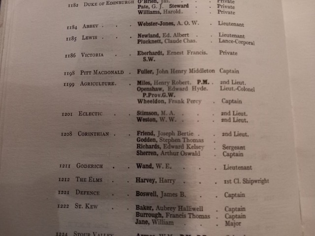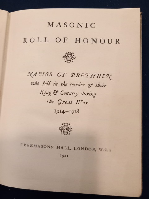 However, Dave had recovered a book from the effects of the late WB Tony Price who had passed to the grand lodge a few years before. This book was a 1921 book ‘ Masonic Roll of Honour’ . It is a hard back book printed in 1921 and lists the fallen, every freemason, who lost their lives in the great war 1914-1918.