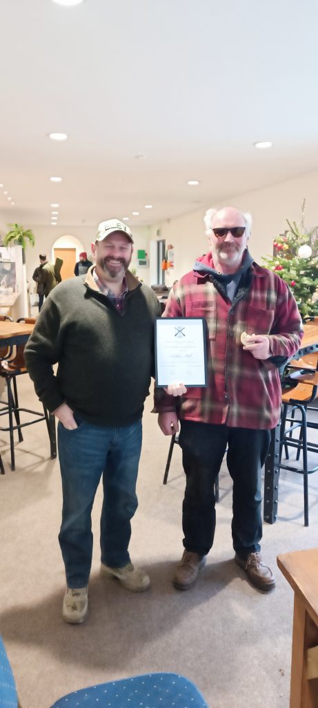 We then convened to the club house where we had hot chocolate and mince pies and the joviality started with lots of fun ribbing amongst the boys. Chairman Rob Collins then presented a framed signed certificate to Vernon Hill the shooting ground owner in honour of his father, W.Bro Arthur Hill.