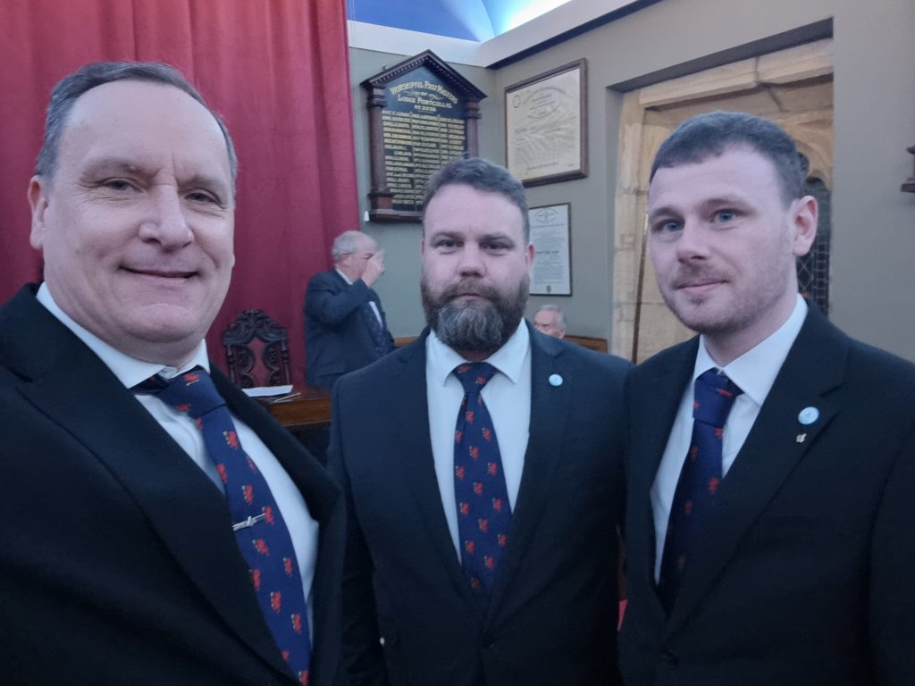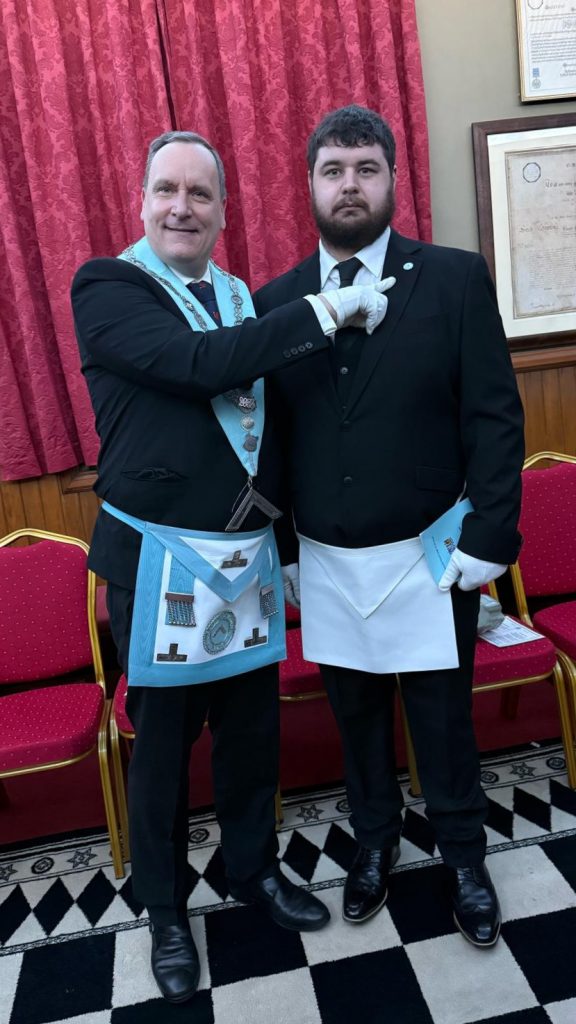 The Past Assistant Provincial Grand Master Richard Winter was back after presiding over the Installation meeting the month before, along with Steve Defries both of whom are regular visitors. Also present were a number of the Adair Club Members. Of course it wasn’t long before the Master Mike Norton the current Chair of the Adair Club, presented our newest member with the Adair Club pin badge.