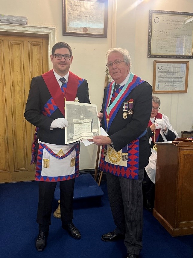 Ex Comp Ray Beckingham presented Comp Andrew Steel his Grand Chapter Certificate, giving his usual, very informative explanation of its some of its characteristics and Symbolisms.