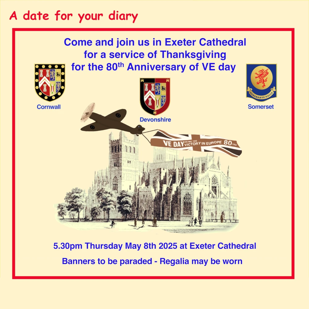 Evensong will begin at 5:30pm on Thursday 8th May 2025, and brethren are asked to take their seats before that so that the parading of banners and dignitaries can begin. The service should take about an hour. It is expected that, as well as the 3 provincial groups, we will be joined by the Lord Lieutenant of Devon and others for the service. During the service, the names of fallen brethren from each of the 3 provinces will be read out and there will be a last post and a piper’s lament to mark their sacrifice