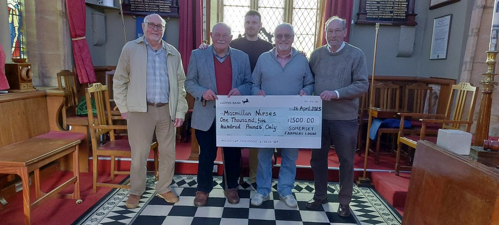 Although the Somerset Farmers Lodge Masonic year has come to an end, activity amongst the brethren continues through charitable donations and a very successful open day. On behalf of Mary Burke, wife of late lodge member David, £250 was presented by the Worshipful Master, Barry Horsgood, to the Yeovil Hospital Charity to support the care of those suffering with prostate cancer.