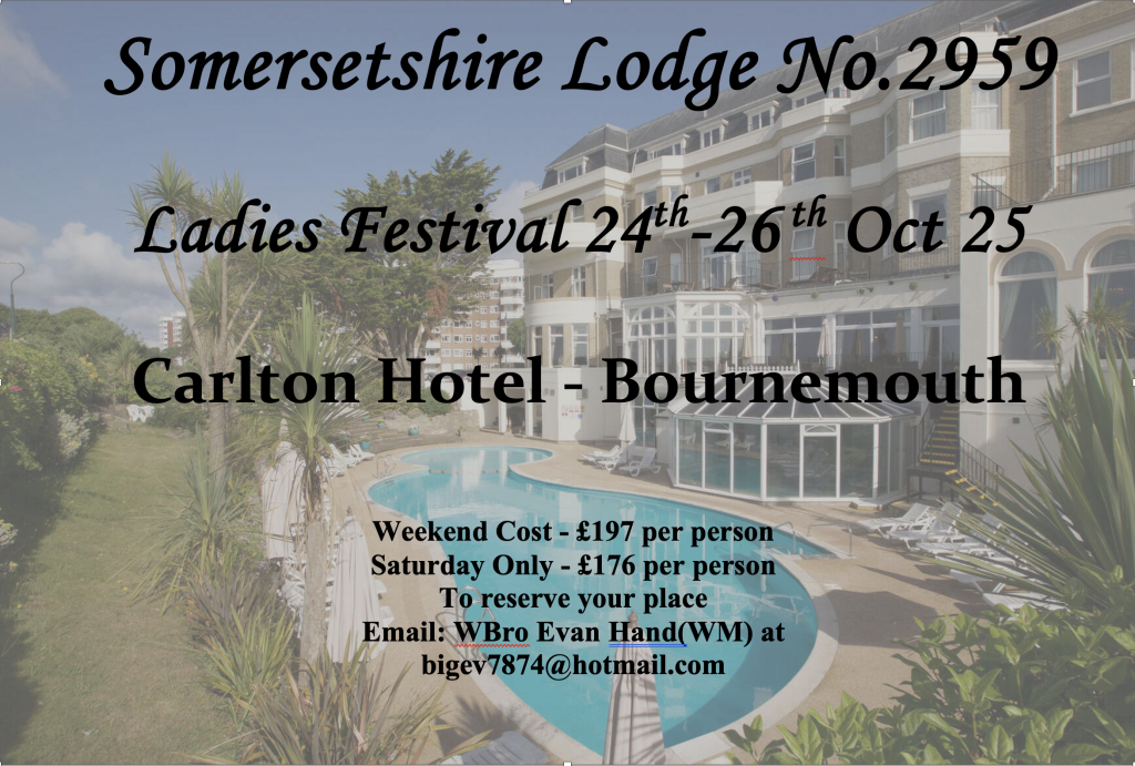 The Prestigious Somersetshire Lodge are holding their Ladies weekend over the 24th to 26th October at the Carlton Hotel Bournemouth.