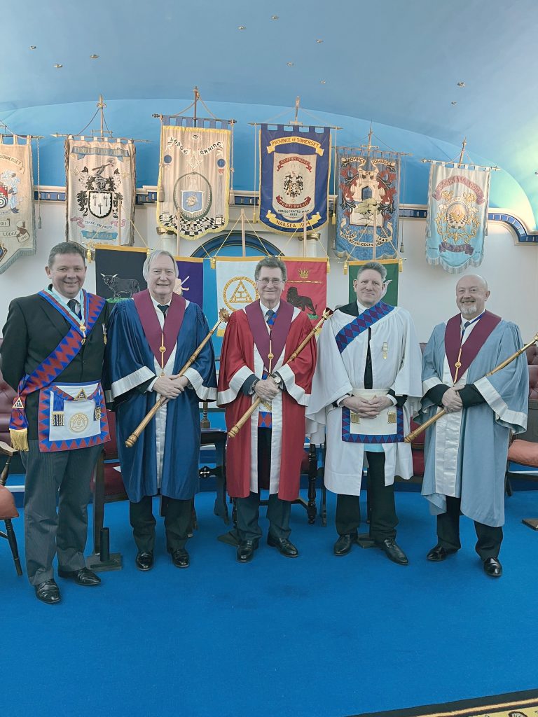 The Principals (excellent companions David Maddern as Zerubbabel, Bob Paice as Haggai, and Mark Wilcox as Joshua) and Sojourners delivered another great ceremony, supported by substitute Principal Sojourner, excellent companion Chris Partridge. This was the third exaltation using Savage Workings, and everything went very well indeed and was very well received.