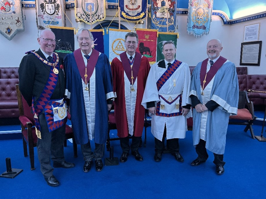 With the new Sceptre safely delivered, First Principal excellent companion David Maddern led the Chapter through an exaltation ceremony of Bro Mark Eastaugh of Estune Lodge. The Principals (excellent companions David Maddern as Zerubbabel, Bob Paice as Haggai, and Mark Wilcox as Joshua) and the Sojourners provided another great ceremony, ably supported by substitute Principal Sojourner, excellent companion Colin Martin Provincial Principal Sojourner. The Address to the Candidate was given by excellent companion Neil Hurcum Deputy Grand Superintendent. The signs were presented by excellent companion Martin Slocombe, and The Mystical Lecture was presented by the three Principals – excellent companions Richard Ellis, Bob Paice and Martin Slocombe.