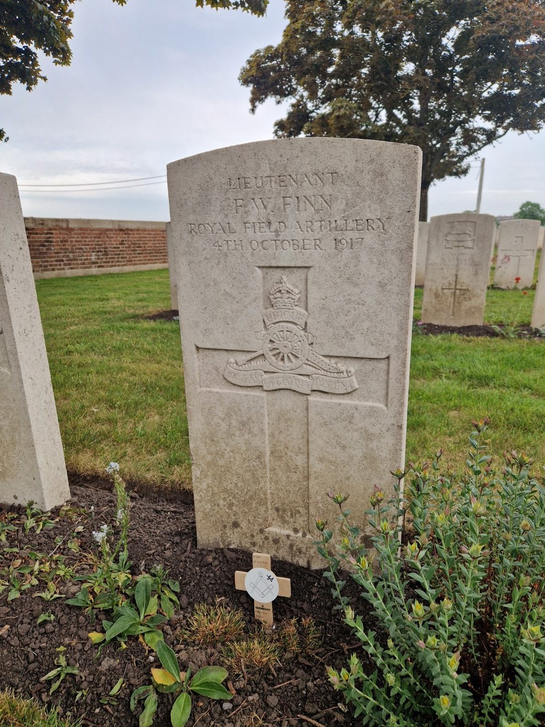 Lt F W Finn has a grave at the Canada Farm Cemetery, between Ypres and Popperinge. He fell during the third battle of Ypres 1917. He was initiated, passed and raised in 1906 and was the Worshipful Master of the lodge in 1911. He fell on 4th October 1917 age 39.