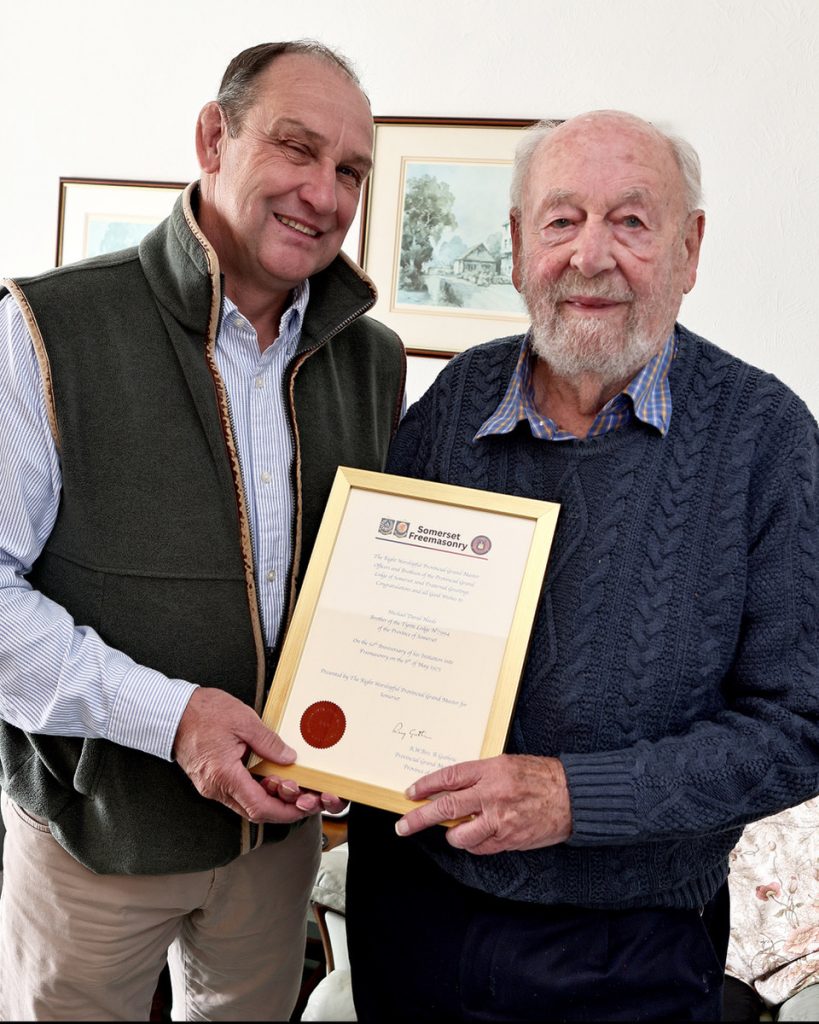 He is pictured here receiving his 50 year certificate by W. Bro Richard Winter PAPrGMon behalf of the Provincial Grand Master.
