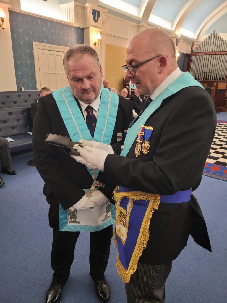 Worshipful Brother Garry Sharp had the honour of presenting Worshipful Brother Bubbs with his Past Masters jewel. Garry was Bubbs Proposer into the Lodge.