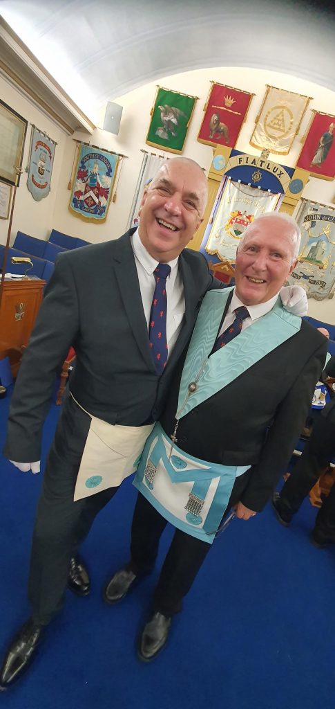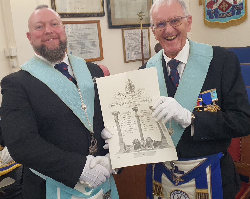 Stuart Wilson was then presented his Grand Lodge Certificate by Tim Gosling. Both looking chipper after their break!