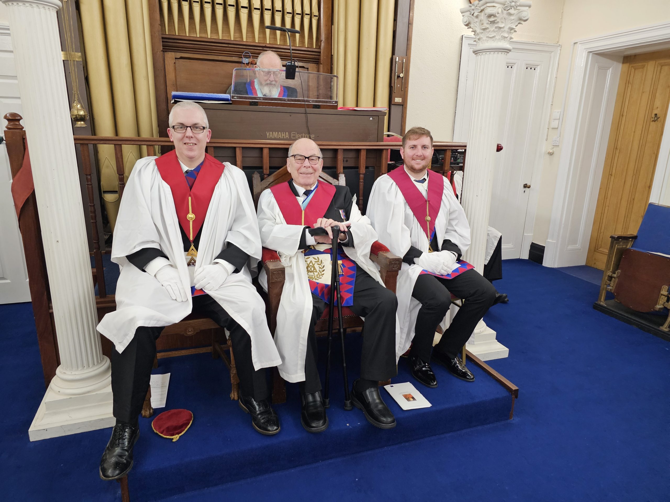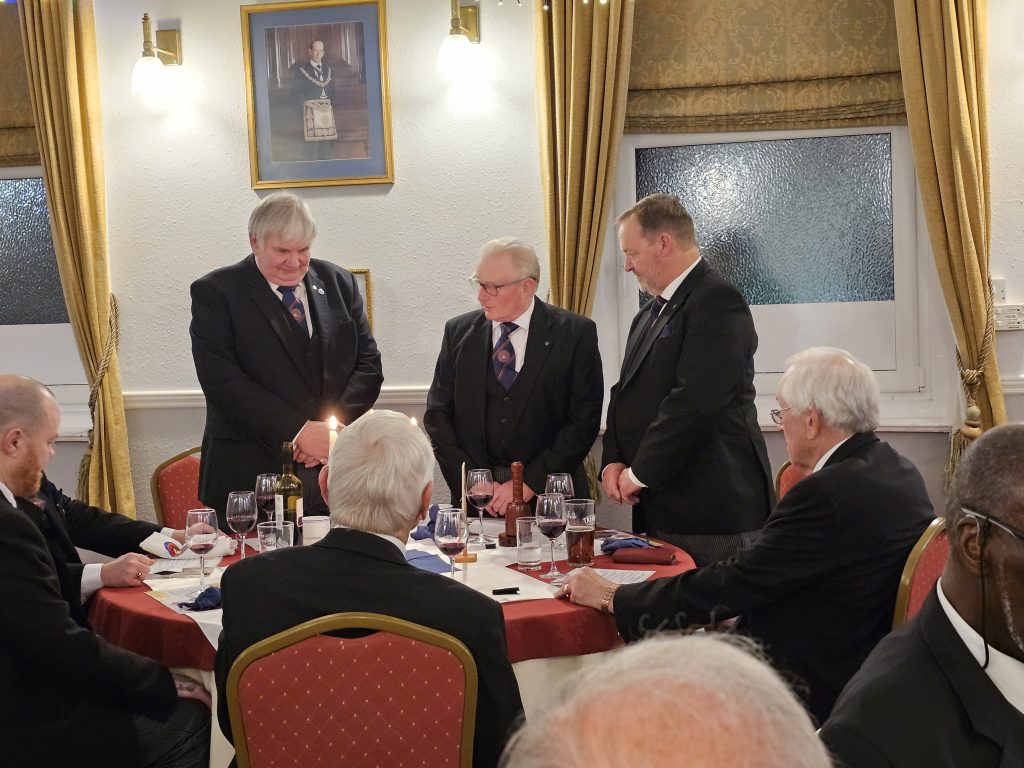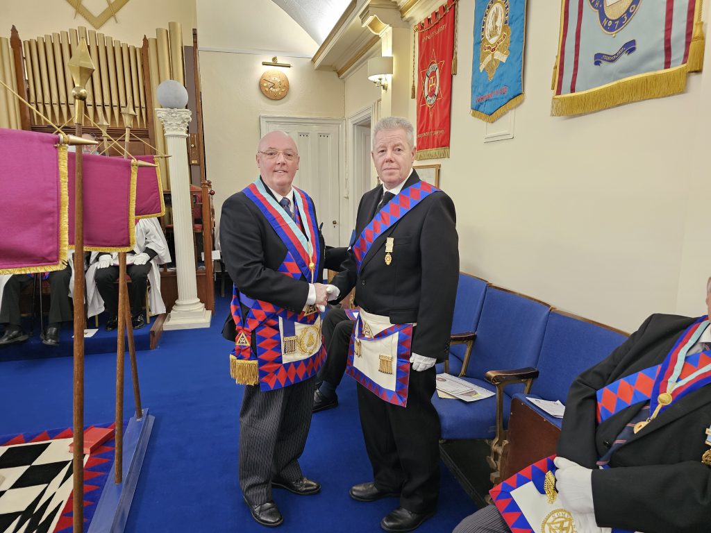 Having heard the Eulogy, the chapter stood in respect of departed merit, and then the Principals got on with the main item of business, to Invest excellent companion Howard Ford as Zerubbabel, and to induct excellent companion John Holman as Haggai and excellent companion Glyn Derrick as Joshua.