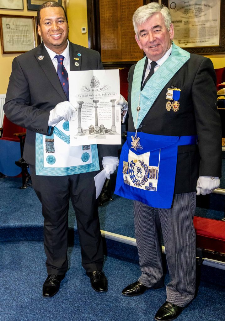 Attendees also had the pleasure of seeing Chris Marchmont present a Grand Lodge Certificate to Bro Richard Joseph, who also received information on Royal Arch Masonry. Another surprise at the end of the evening was a congratulations and presentation to Chris Marchmont on the celebration of his 35 years service in Freemasonry.