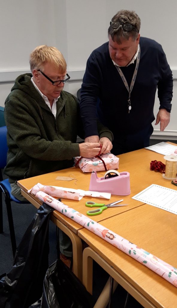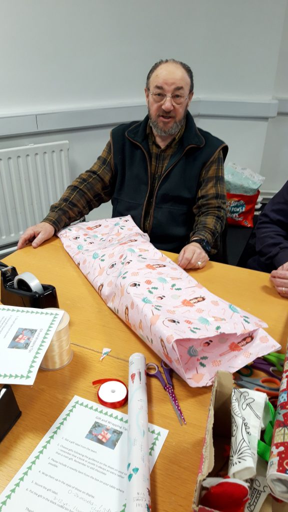 Christmas Sparkle is a project run by the community for the community. They work with local schools and organisations to support families in need. Their aim is to give a Christmas gift to every child aged 0-18 living in difficult circumstances in the Taunton and Wellington community. Christmas is well and truly here, so on Monday 1st December some of Santa’s Masonic Elves (Charlie Barker, Richard Wilson, Ian Clift, Russell Biss, Harry Price & Roger Bailey) popped along to support that aim, by making a donation and then getting stuck into wrapping presents, fortified by tea and biccies. They helped wrap the various gifts above into finished presents and load them into Santa’s (faithful black bag) Festive Sacks! Ian & Richard captured below doing a Festive Wrapping double act! Russell also pictured contemplating his next paper fold move.