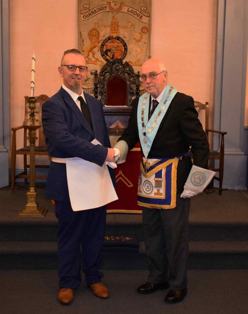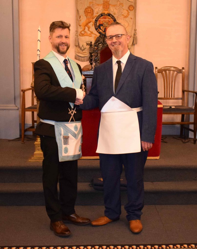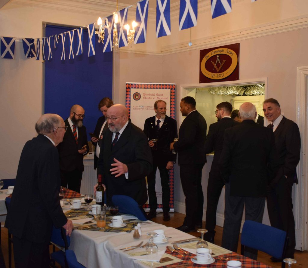 A lively Festive Board of a Burns Night Supper that was enjoyed by all. James Jefferies, as his Proposer, gave to Toast to his long standing friend Mathew. He mentioned that as both are in the building trade they refer themselves as ‘Operative Masons’, Then Neil explained ‘The Fire’ to Mathew. The Toast to the Visitors was in the capable hands of Membership Officer, Jerry Hann, and as we had a large contingent of visitors from Kenneth Kinnersley Lodge it was only proper that KK member Robin Browning responded on their behalf, and in so doing complemented the ceremony.