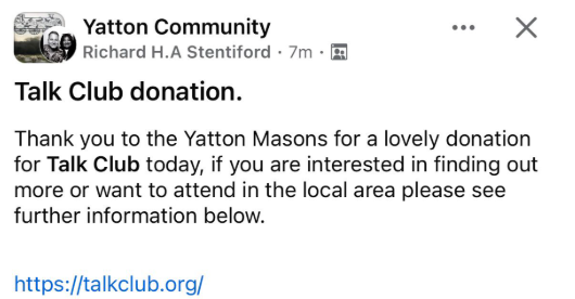 Forest of Mendips latest donation from the money raised by last year’s WM Bubbs Burbage was donated to Richard the Captain of the Yatton branch of the Talk club that meet in Yatton on a monthly basis to help Men with Mental problems. There is also a branch at Congresbury.